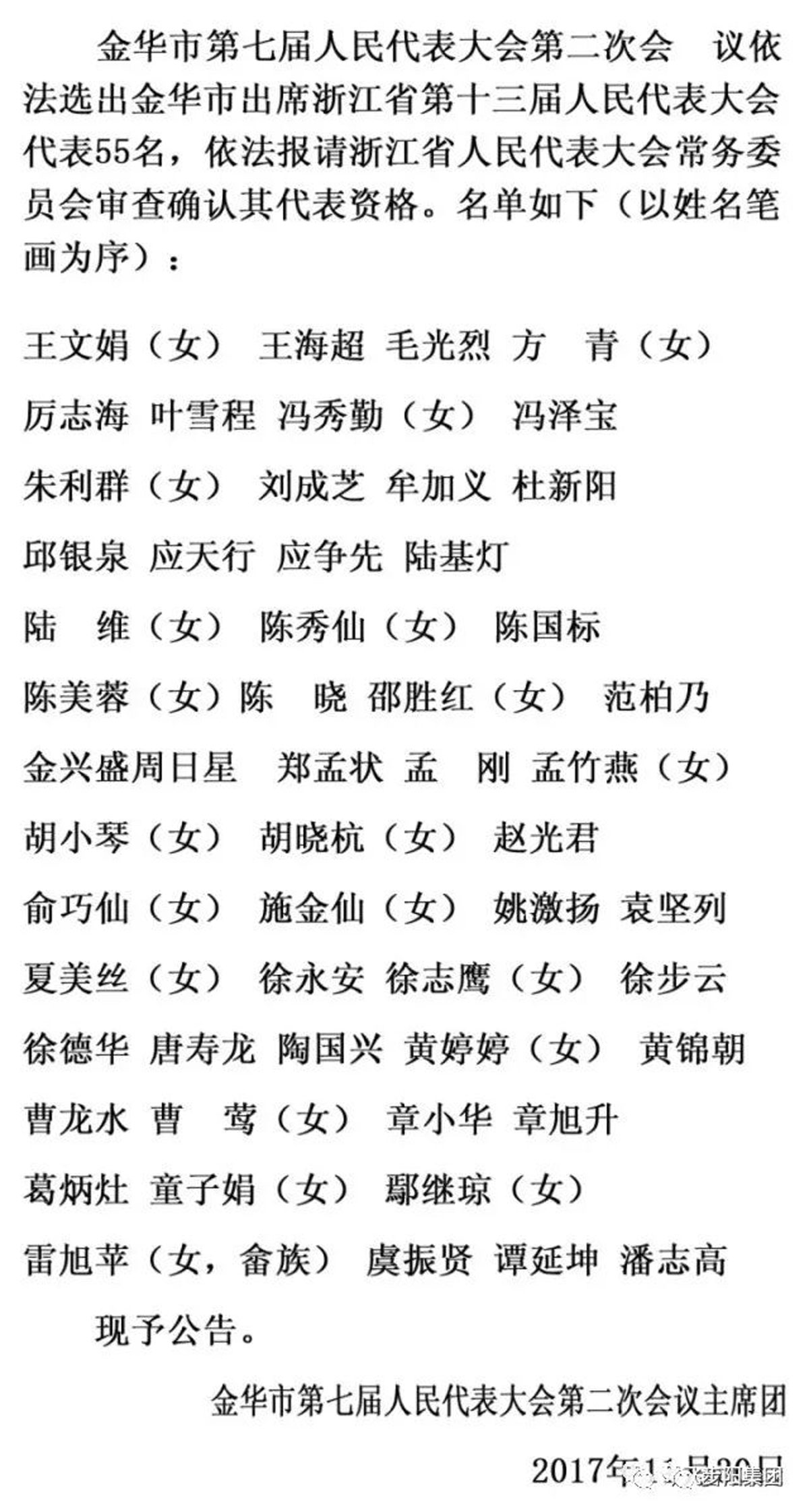 本次大会上,通过无记名投票方式进行差额选举,选举产生出55名金华市出席浙江省第十三届人民代表大会的代表。